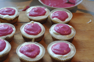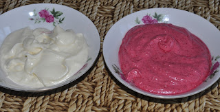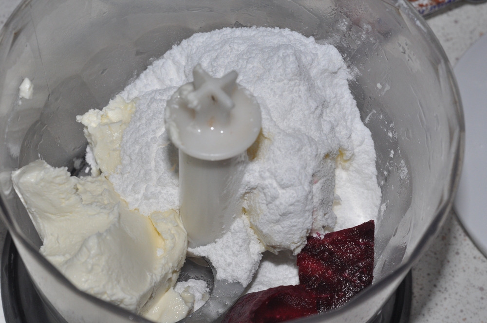 Intre timp pregateste glazura. Pune in robot jumatate de pachet de unt, jumatate din zaharul pudra si din crema de branza si sfecla rosie. Astfel, faci glazura roz. Amesteca si restul de unt, zahar pudra si crema de branza si ai glazura alba.
