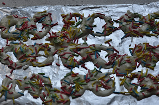 Pregateste mai intai funditele din ciocolata alba. Topeste ciocolata in bain marin si deseneaza pe o folie de aluminiu decoratiile dorite. Presara fulgi dulci colorati sau din ciocolata. Baga funditele la congelator.
