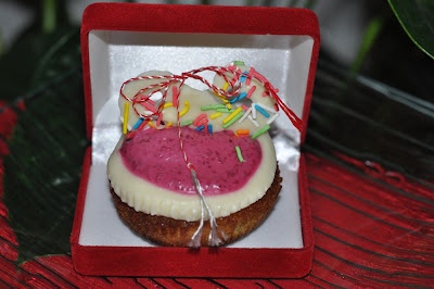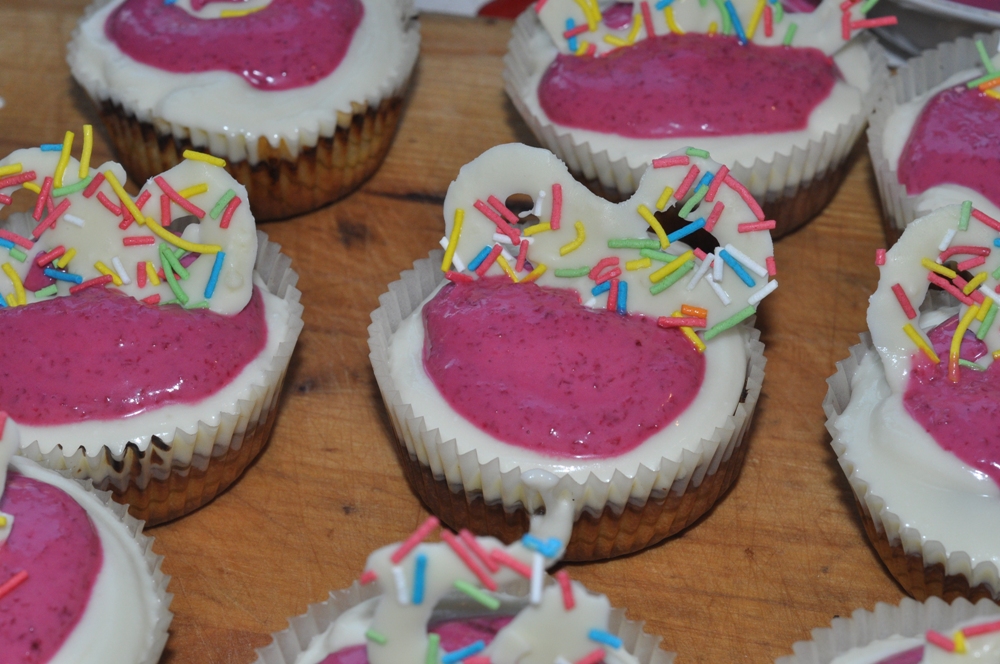 Pentru glazura: 1 pachet de unt, 1 cana de zahar pudra, 1 cutie de crema de branza, 1/3 de sfecla rosie, 1 ciocolata alba, fulgi pentru decorat