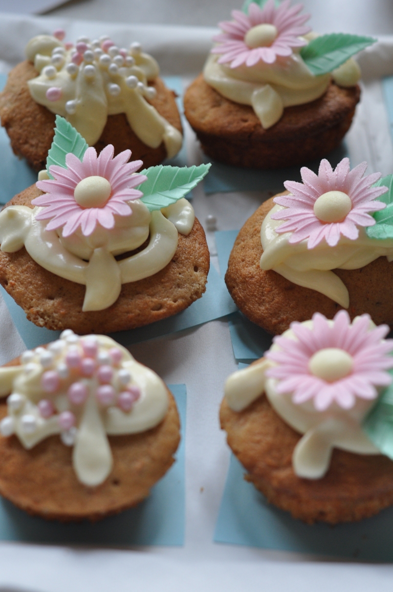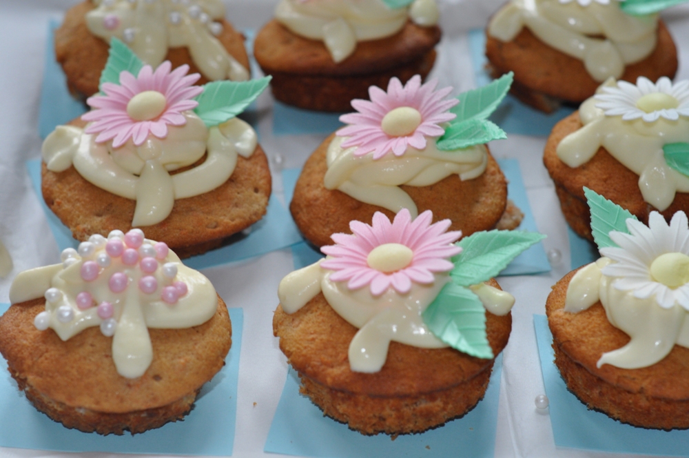 briosele cu glazura si apoi am pus margarete si margelute sidefate.