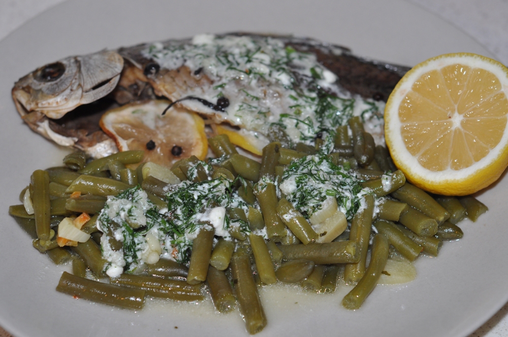 INGREDIENTE (pentru 2 persoane): 2 pesti medii (pastrav, stavrid, sau orice fileuri), 1/2 de pachet de unt, 2 lamai, 1 castron mare de fasole verde, piper, sare, 2-3 catei de usturoi, capere (optional), 1 legatura de marar