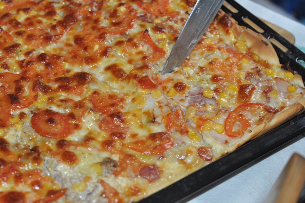 Incinge cuptorul. Taie ingredientele pentru pizza. Da pe razatoare cascavalul si mozzarella si amesteca-le. Unge tava cu ulei, presara putin pesmet, ca sa nu se lipeasca aluatul. Taie in jumatate aluatul de pizza. Apoi inca o data in jumatate. Intinde prima foaie. Presara pe ea putin praf de usturoi, apoi mozzarella si cascaval, apoi restul de ingrediente, si inca un strat la sfarsit de mozzarella si cascaval. Baga la cuptor pentru 20 de minute.