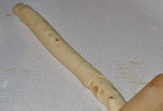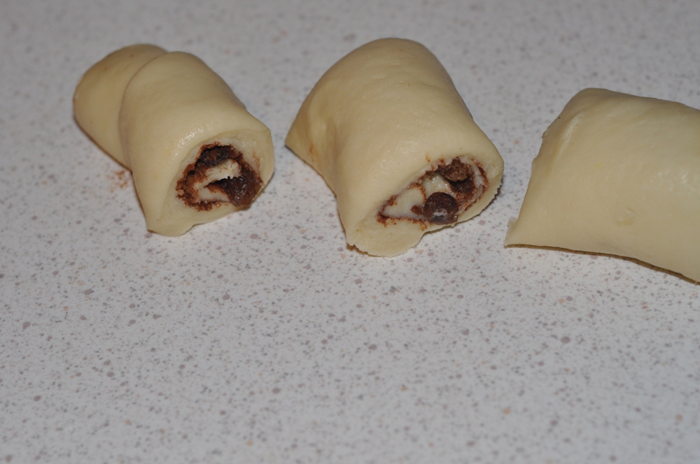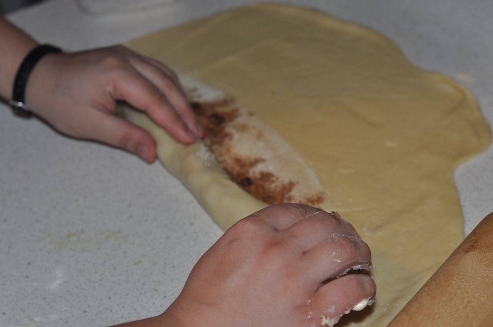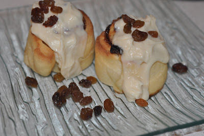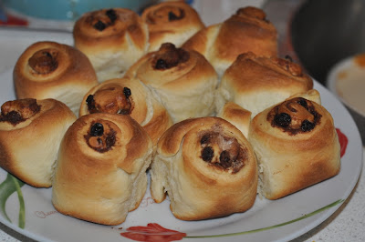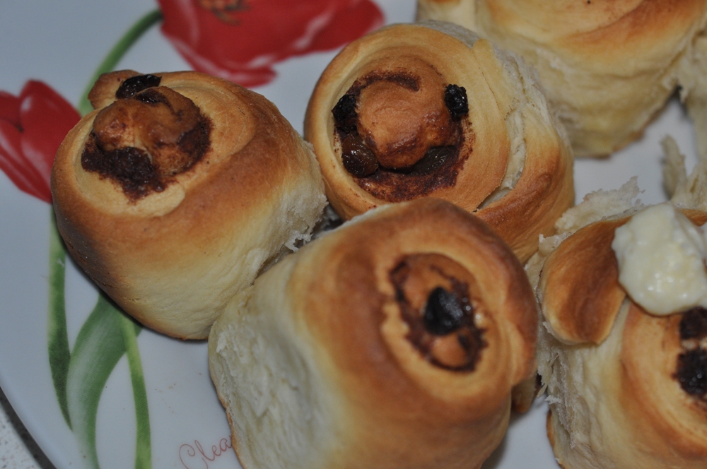 Cand aluatul a crescut indeajuns frmanata-l iarasi inca 2-3 minute apoi taie-l in doua. Incepe sa intinzi prima jumatate. Unge baza ei cu unt, apoi presara zaharul si scortisoare si stafidele. Ruleaza aluatul, apoi taie-l in felii groase. Aseaza rulourile intr-o tava unsa cu ulei sau unt in prealabil. Procedeaza la fel si cu cealalata jumatate. Pune rulourile la cuptorul incins pentru 20 de minute.