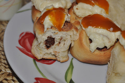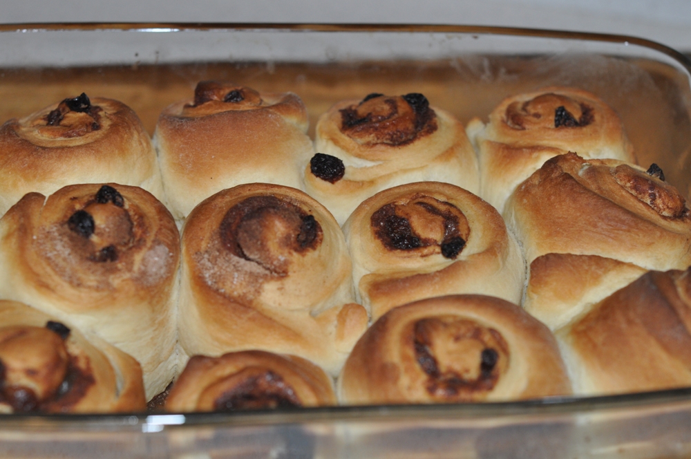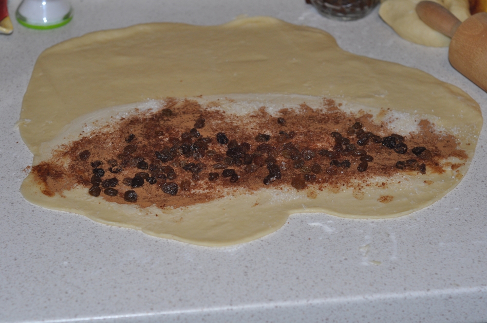 Cand aluatul a crescut indeajuns frmanata-l iarasi inca 2-3 minute apoi taie-l in doua. Incepe sa intinzi prima jumatate. Unge baza ei cu unt, apoi presara zaharul si scortisoare si stafidele. Ruleaza aluatul, apoi taie-l in felii groase. Aseaza rulourile intr-o tava unsa cu ulei sau unt in prealabil. Procedeaza la fel si cu cealalata jumatate. Pune rulourile la cuptorul incins pentru 20 de minute.