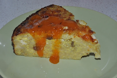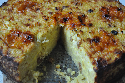 Adauga pastele, apoi amestecul de lapte, oua si branza. Decoreaza cu fructe sau dulceata (eu am folosit dulceata de caise)