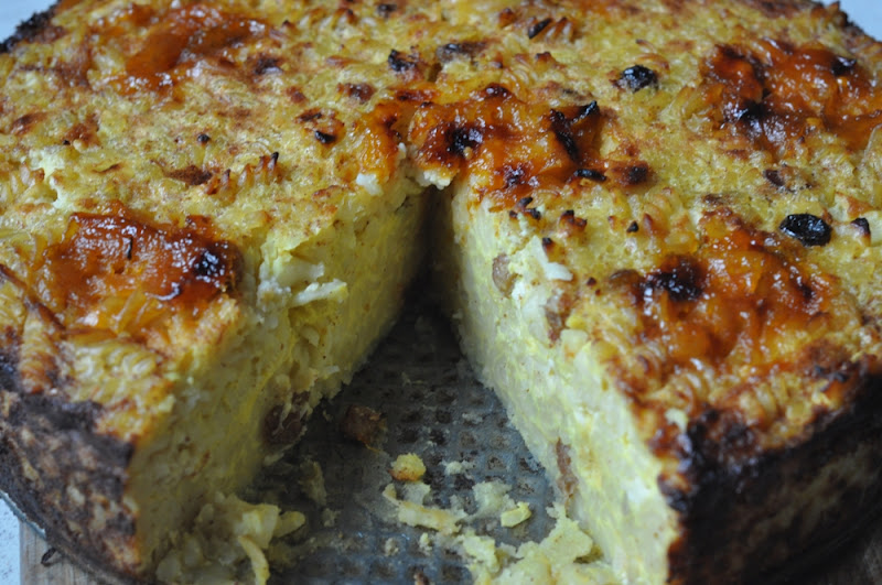 INGREDIENTE: 2 pungi mici de mini-paste (eu am ales fusilli si stellini), 4 oua, 300 g de branza dulce, 1 ceasca de zahar, 1 ceasca de lapte, 50 g de unt, scortisoara, stafide, gris