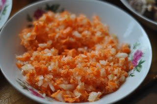 pune varza la calit. Adauga apoi morcovul si ceapa si carnea de curcan.