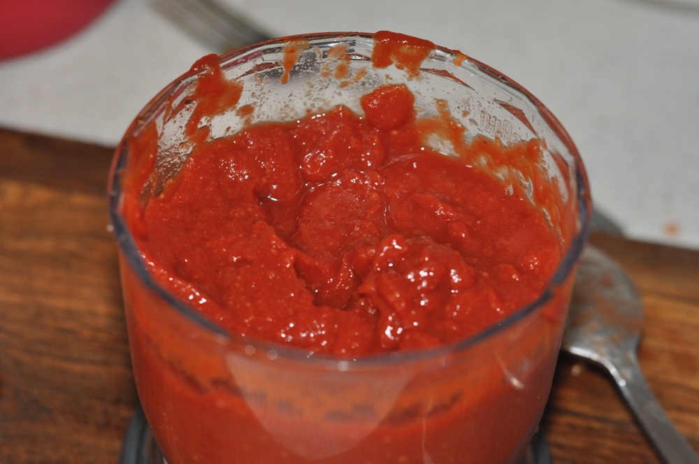 bulionul, usturoiul si sarea, piperul, boiaua dulce si amesteca pana ce devine totul o pasta.