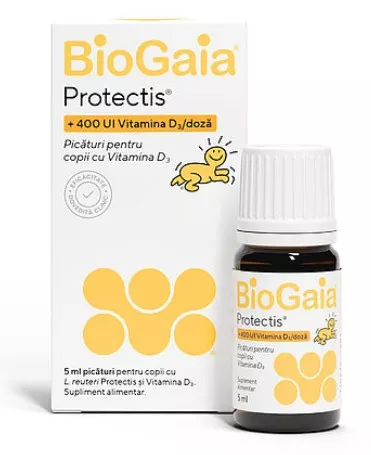 Pentru sprijin suplimentar al capacității naturale de apărare, există șipicăturile BioGaia® Protectis® cu Vitamina D3, care combină beneficiile bacteriilor vii cu cele ale vitaminei D3 — importante în primii ani de dezvoltare. Vitamina D contribuie la funcționarea normală a sistemului imunitar, la menținerea sănătății sistemului osos, la menținerea funcției normale a sistemului muscular, precum și la menţinerea sănătăţii dinţilor.