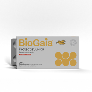 În acest sens, poți suplimenta microbiota ta și a restului familiei cutabletele masticabile BioGaia® Protectis® Junior. Acestea conțin tulpina Limosilactobacillus reuteri Protectis®, testată în peste 170 de studii clinice, demonstrându-i siguranța și eficacitatea. Acest supliment alimentar este potrivit pentru copiii cu vârsta de peste 3 ani, precum și pentru adulți. Pentru bebeluși, recomandate sunt variantele sub formă de picături.